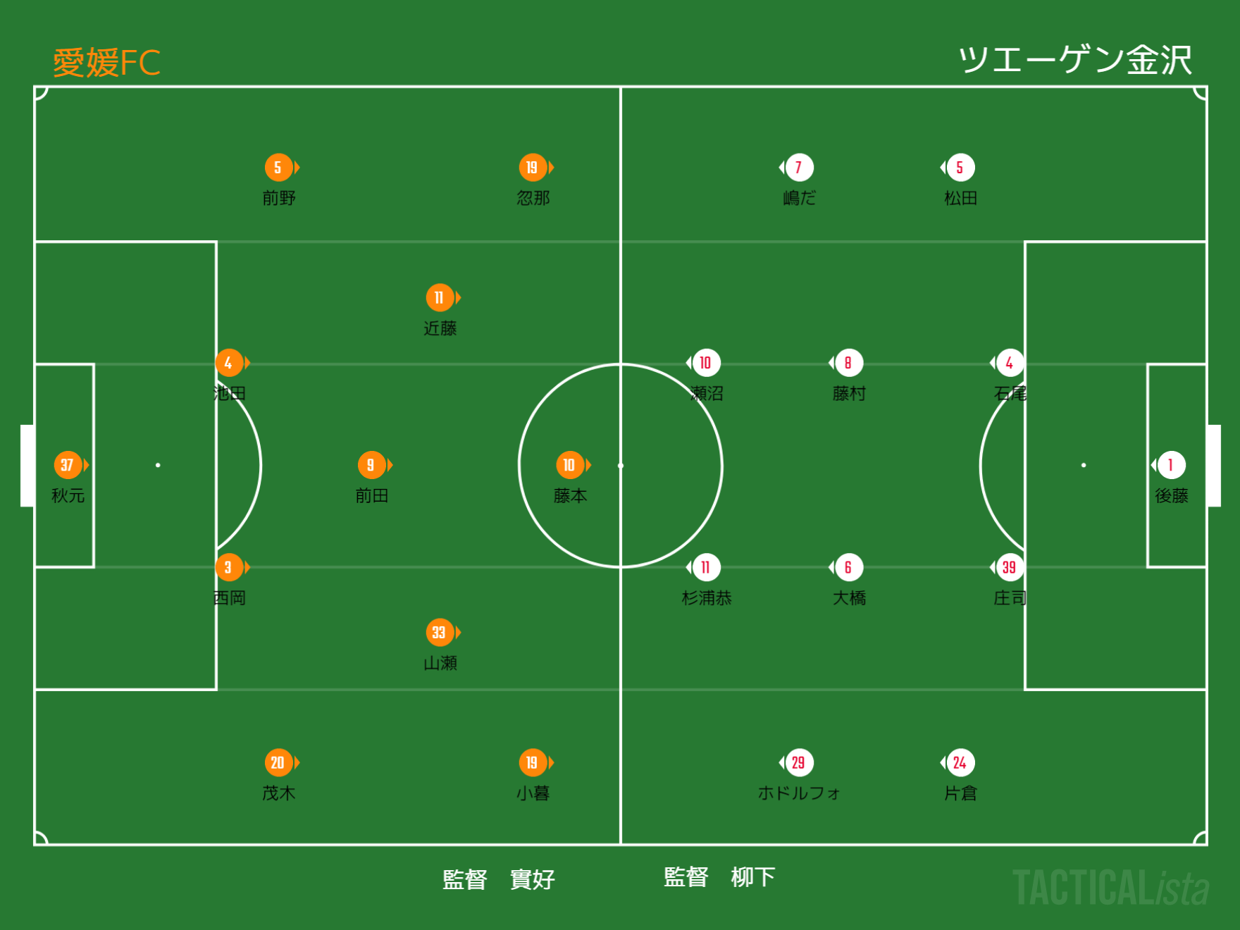 フォーメーション 1-4-3-3(愛媛)1-4-4-2(金沢)