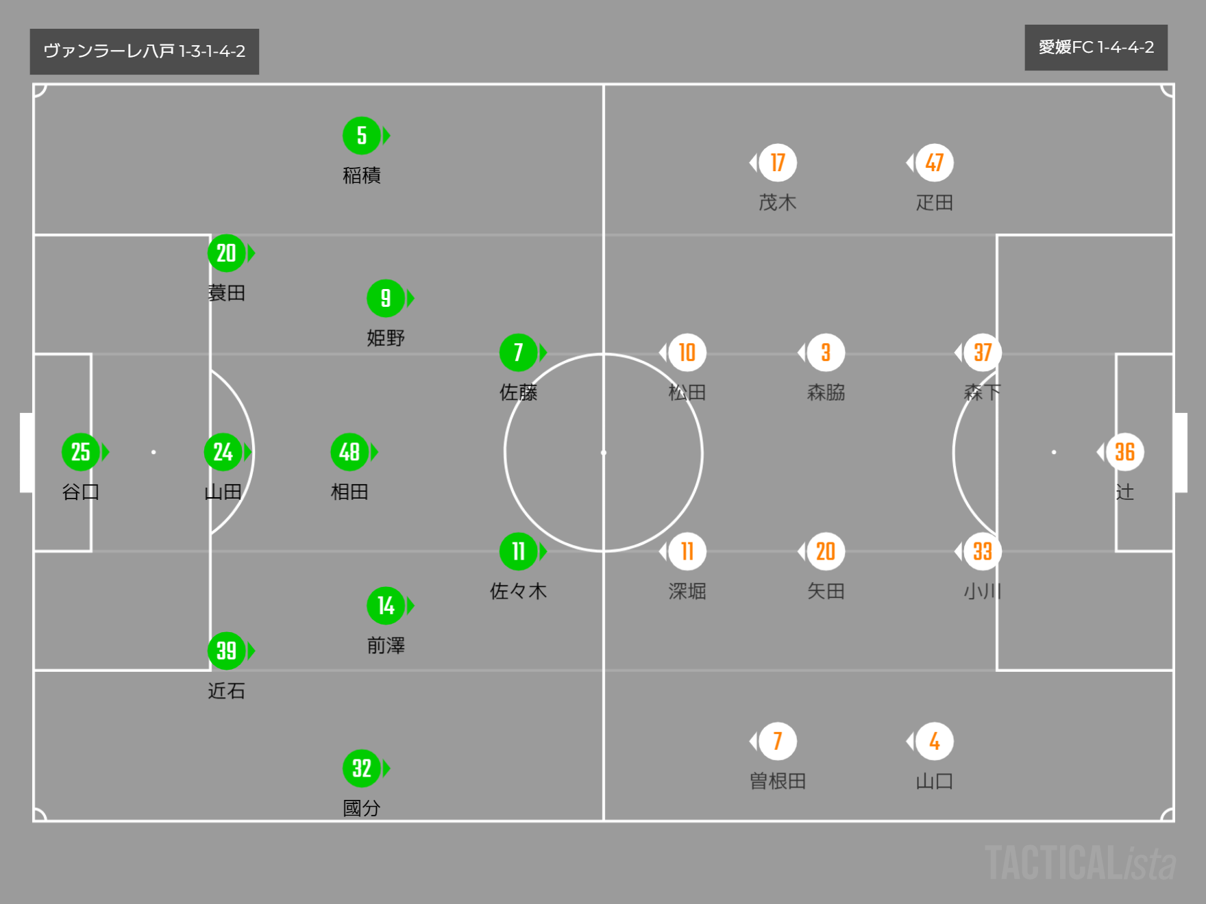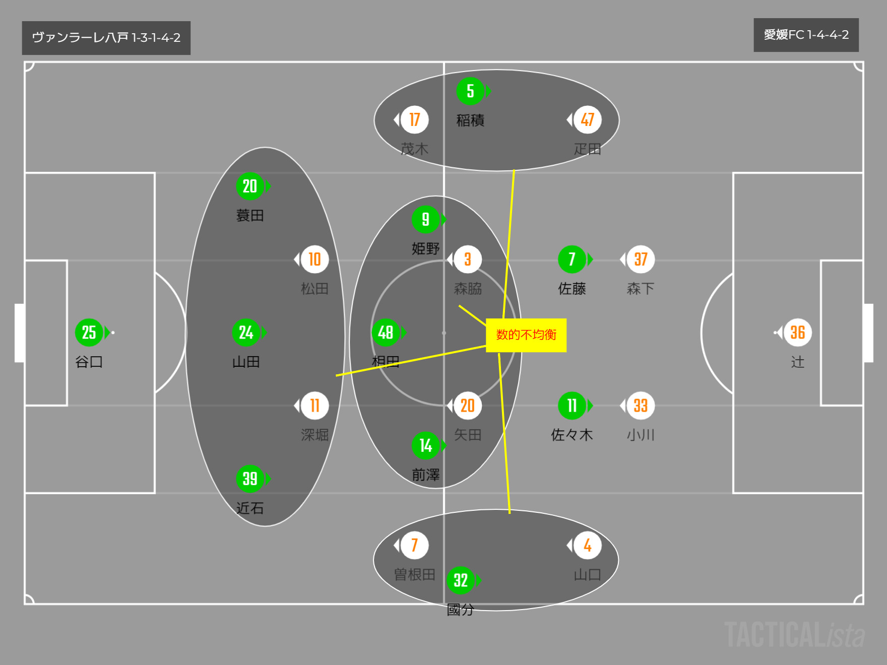 愛媛は1-4-4-2で、八戸は1-3-1-4-2という布陣。数的不均衡の場所をどうするかがポイントとなる。