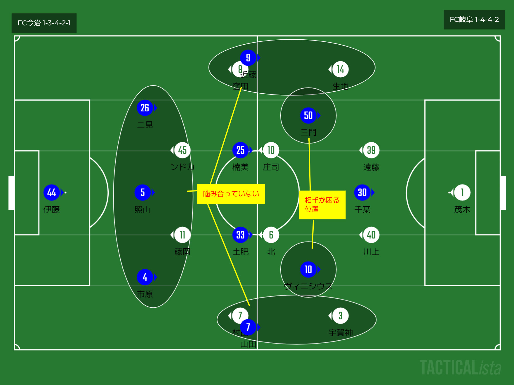 今治はいつものように1-3-4-2-1で、岐阜は1-4-4-2となり、ライン間に配置していたり、数的不均衡になっている箇所がある。