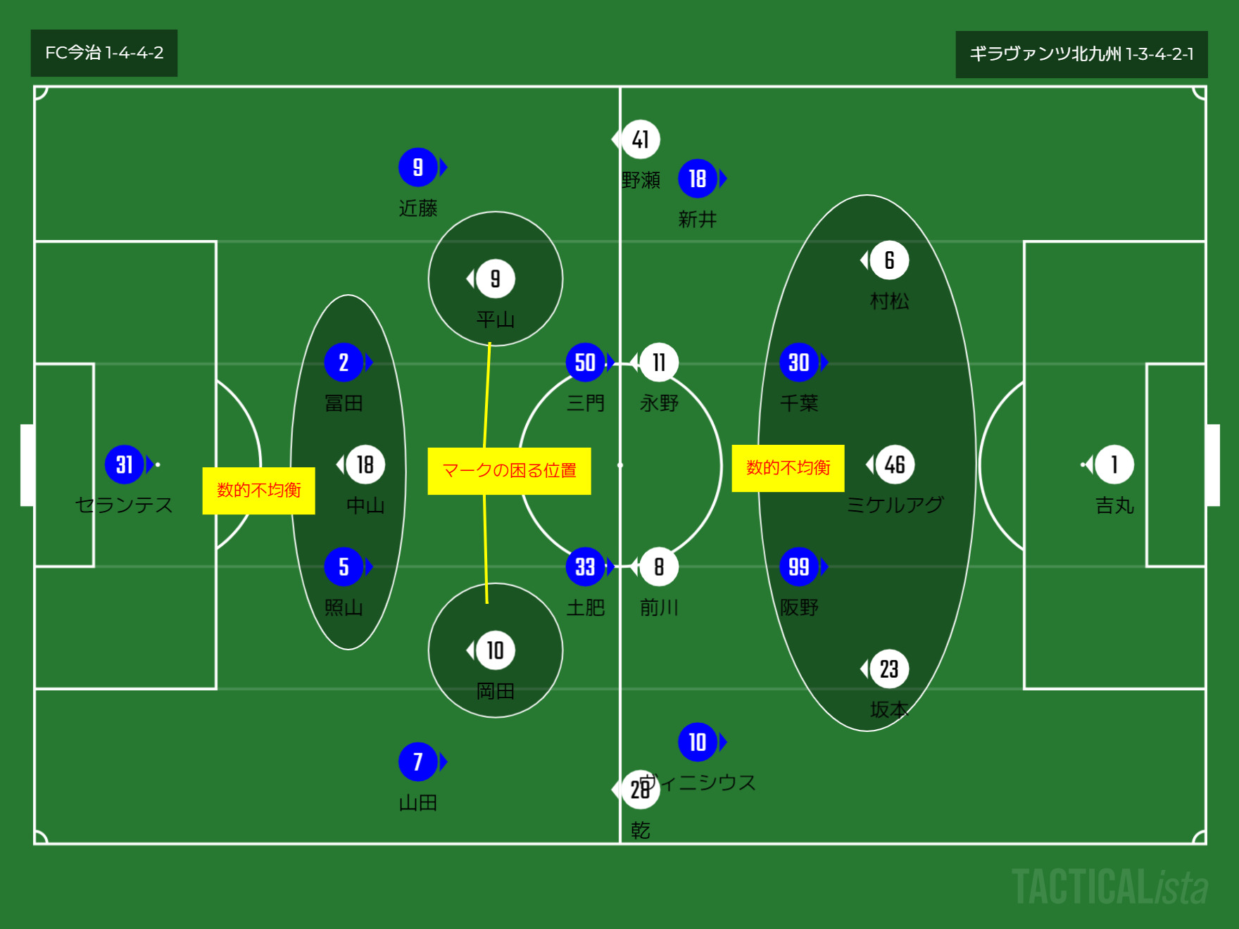 今治が1-4-4-2で、北九州が1-3-4-2-1ですね。今治はビルドアップ時の優位性をいかし、安全確実に相手陣地に侵入し、最後の質を高められる亜か。