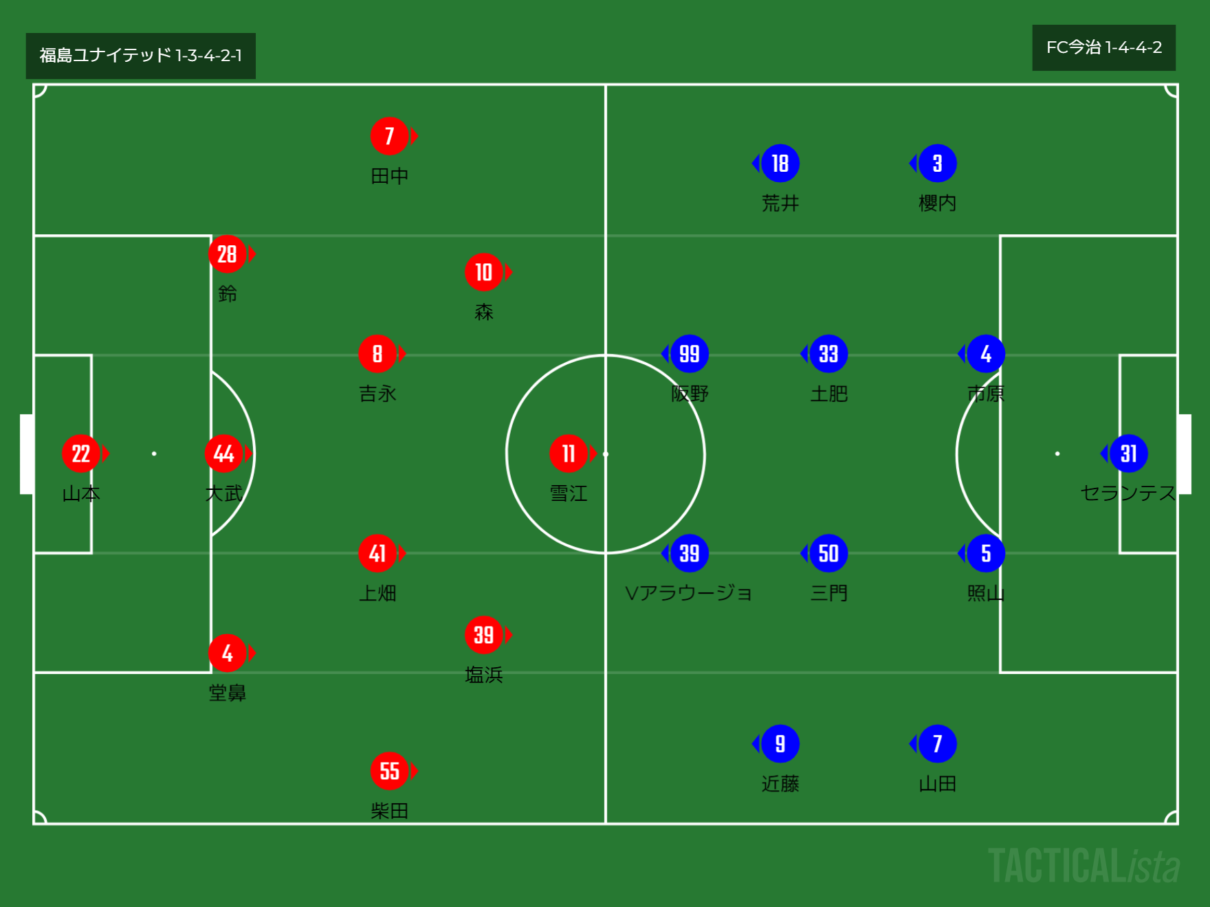 フォーメーション 1-3-4-2-1(福島)1-4-4-2(今治)