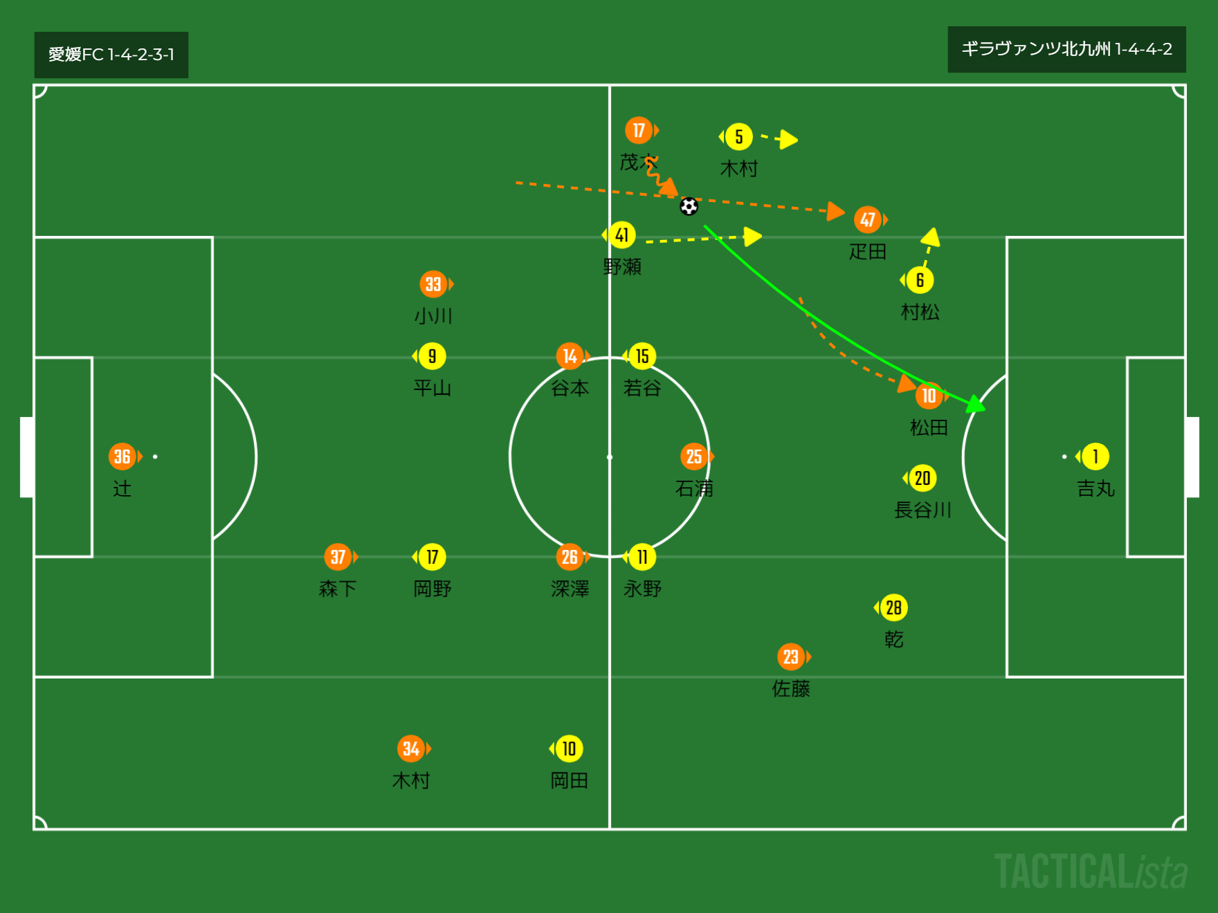 それにより、茂木へのDFは背後へパスを出さ差ないように縦切りとなり、茂木のカットインからのクロスが可能となった。