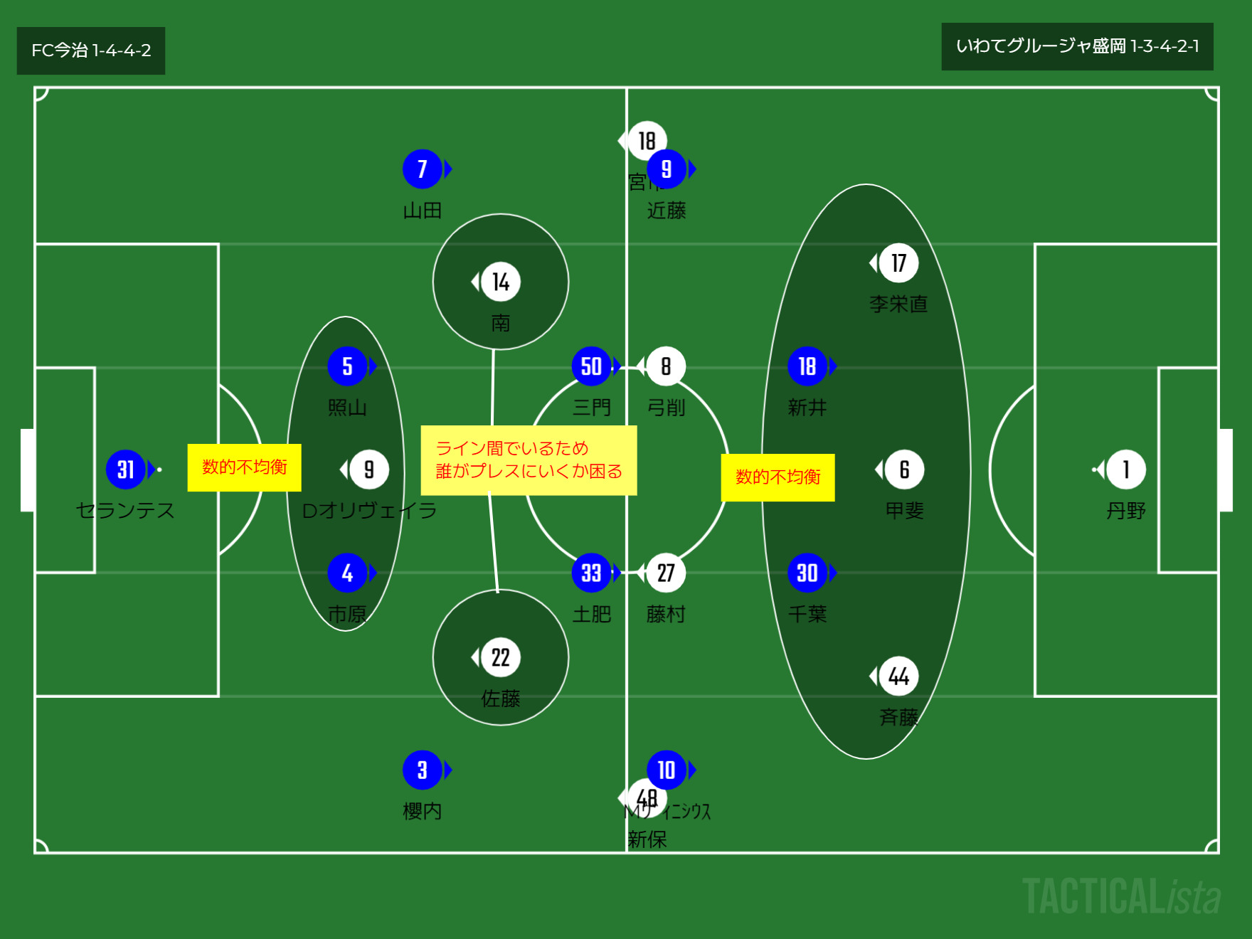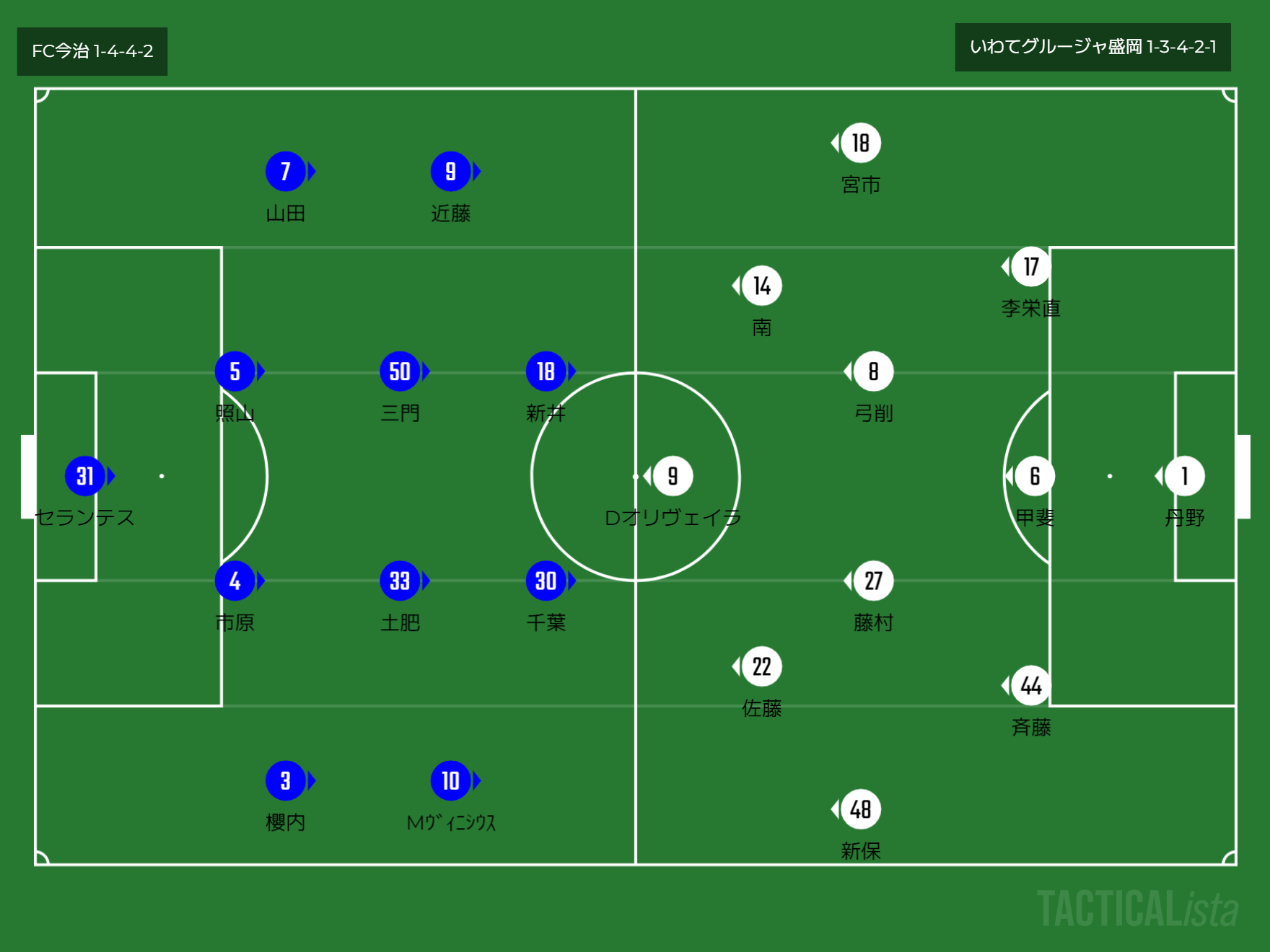 フォーメーション 1-4-4-2(今治)1-3-4-2-1(岩手)