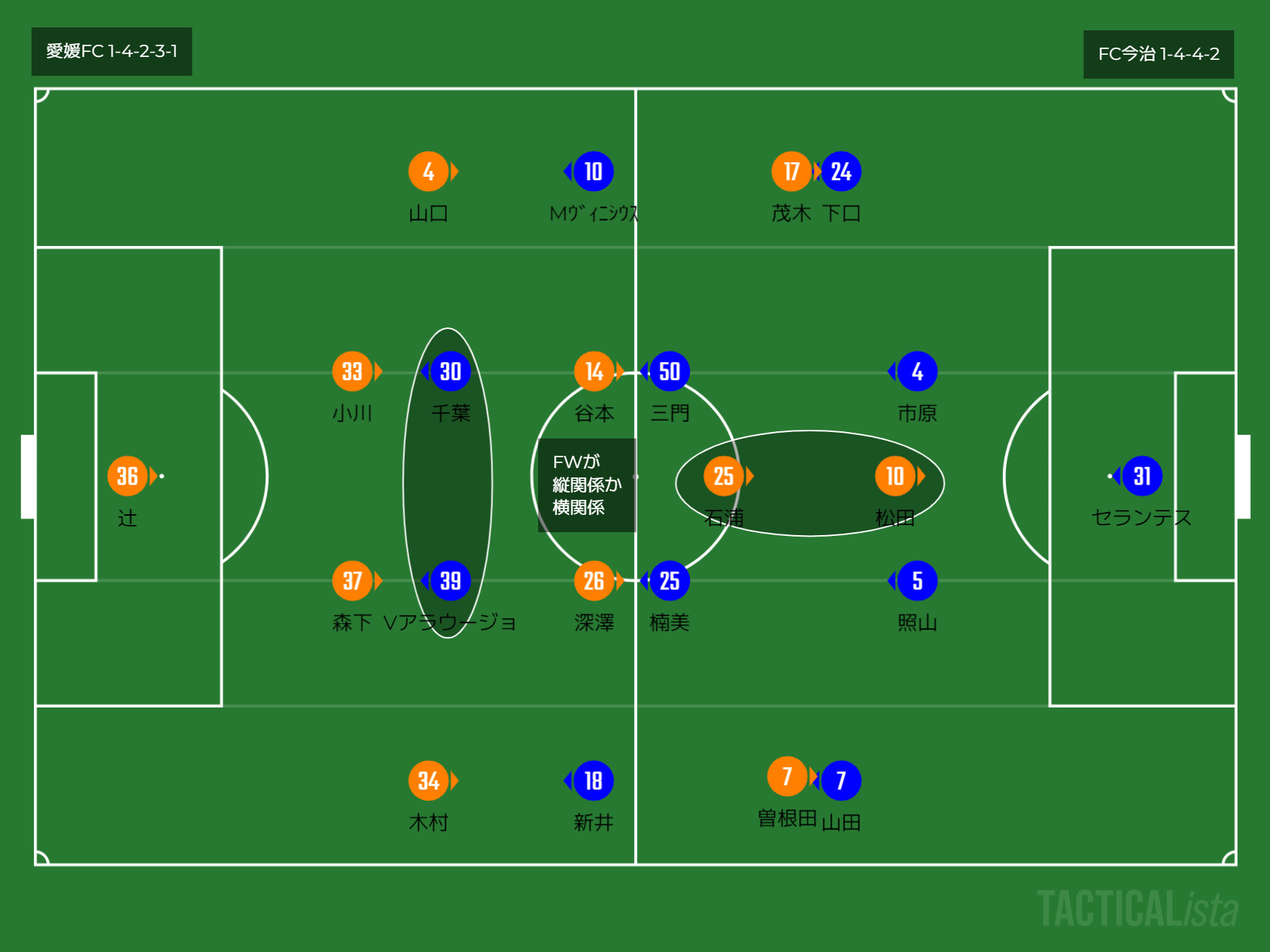 愛媛が1-4-2-3-1で今治が1-4-4-2ということで、2トップが縦関係か横関係かという違いになる。