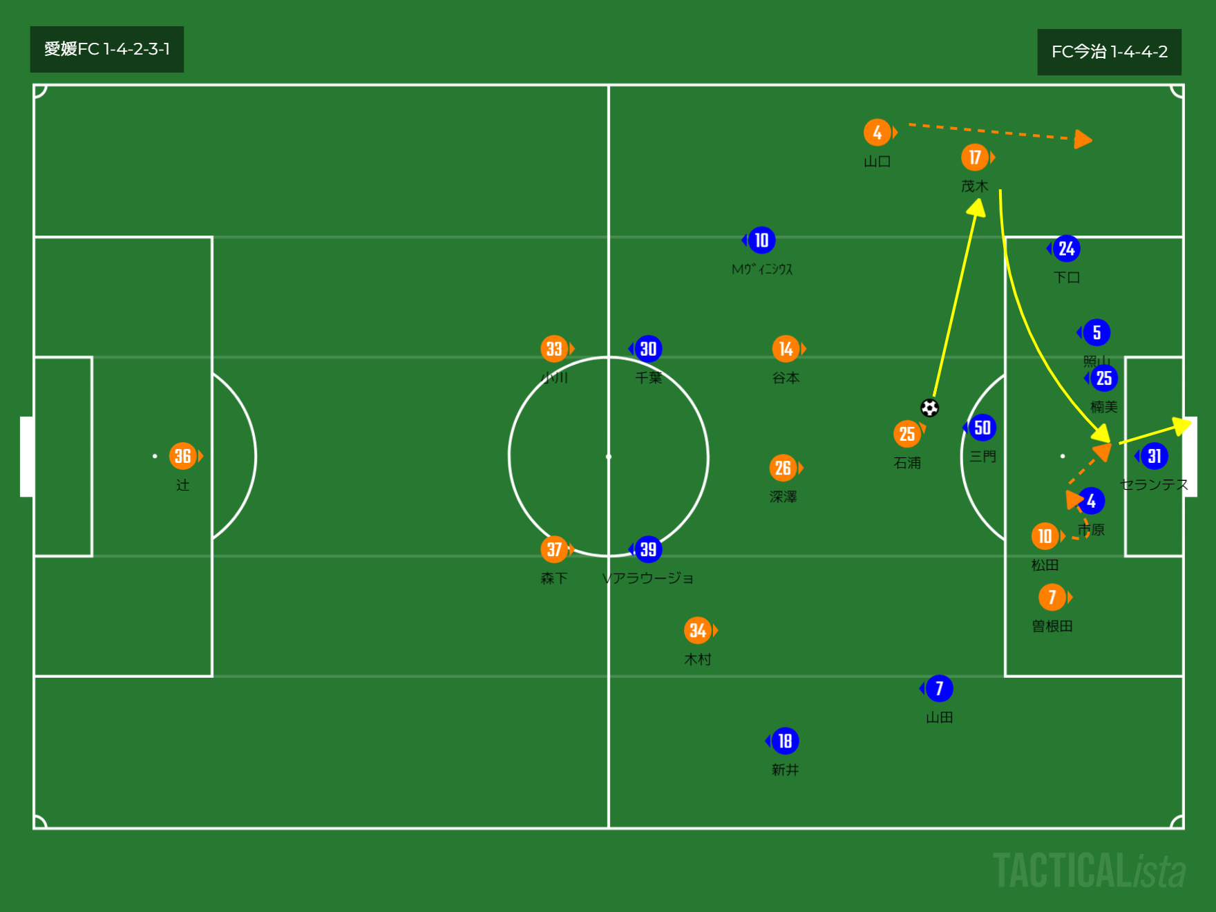 愛媛の方は松田が基本的にはCBの背後を狙い、石浦がDFとMFの間でボールを受けるというイメージ。一方、今治は千葉とアラウージョがどちらかがDFの背後に走れば、どちらかはDFとMFのライン間でボールを受けるというようなイメージ。