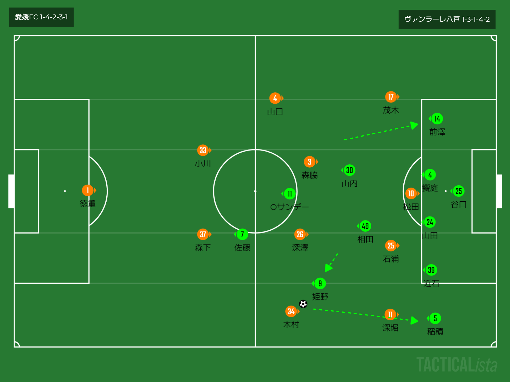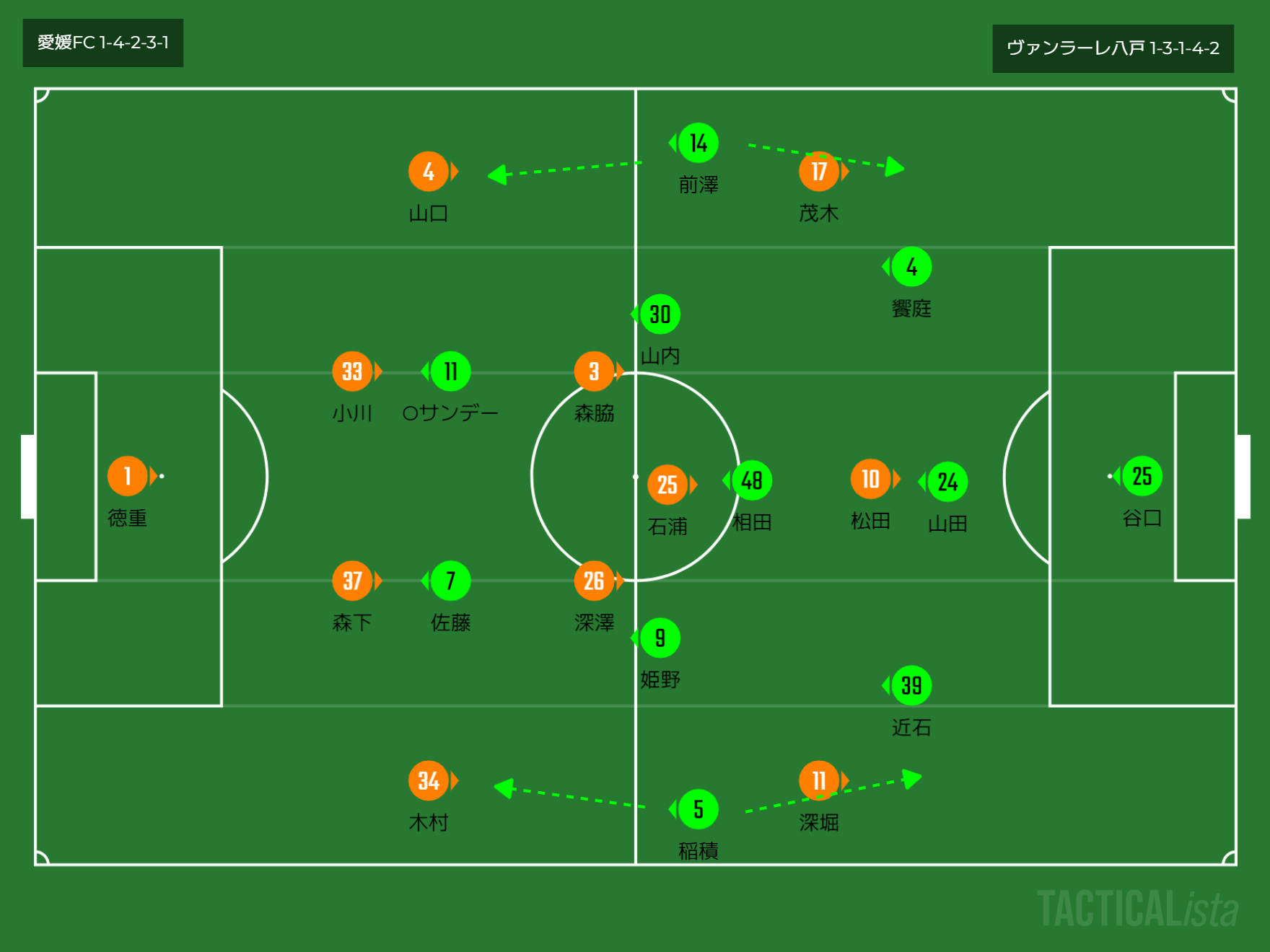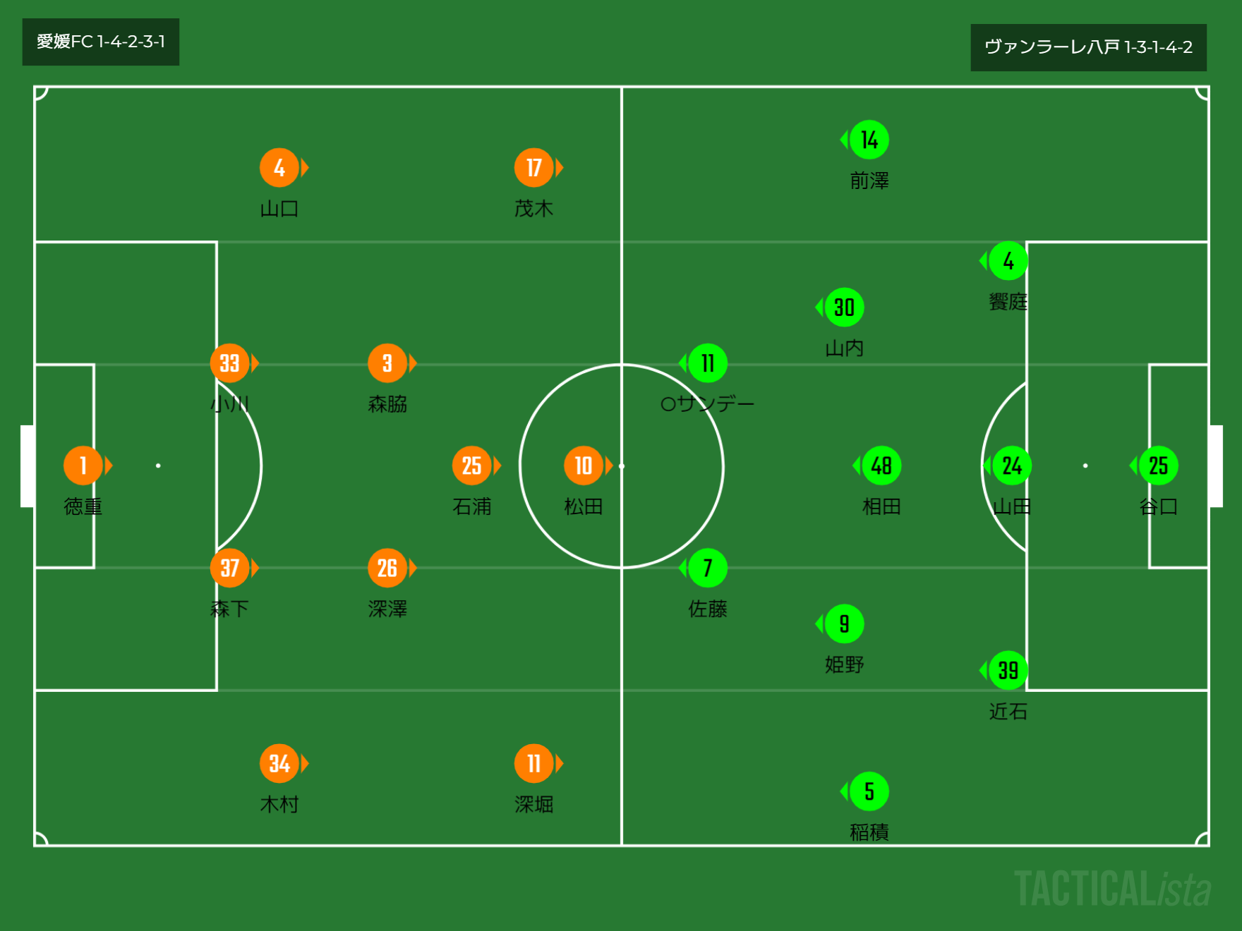 愛媛が1-4-2-3-1で八戸が1-3-1-4-2という布陣。噛み合わせてみるとサイドのところで、八戸の両ウイングバックが出れば、噛み合うし、下がれば、愛媛のサイドバックが浮いてくるという布陣。