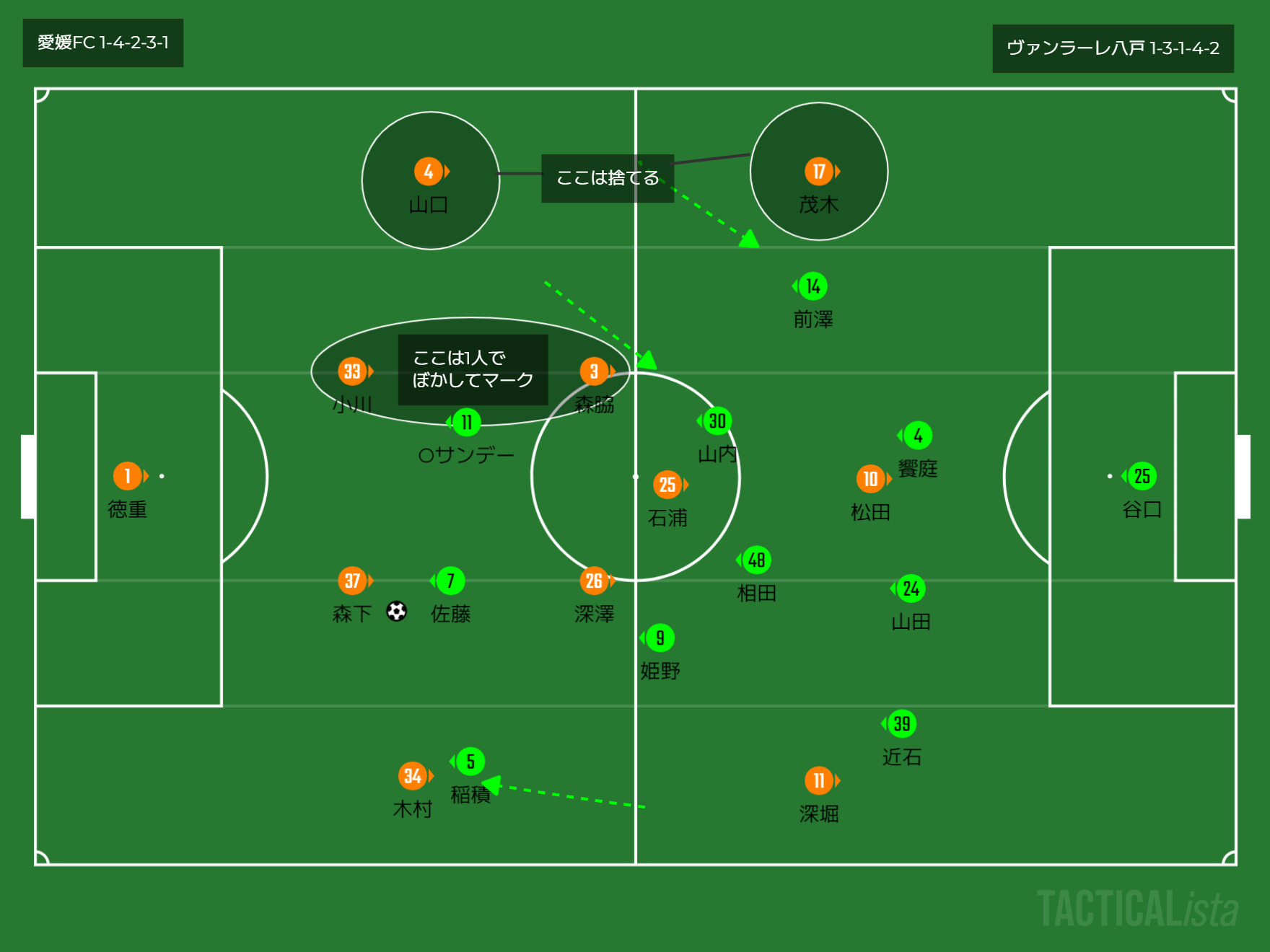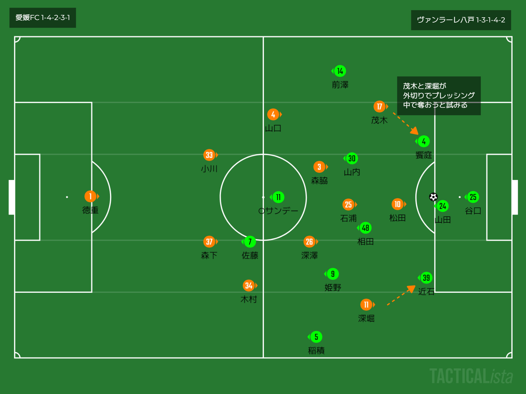 八戸の3バックに対して、愛媛はどのようにプレッシングかけにいったのか。
