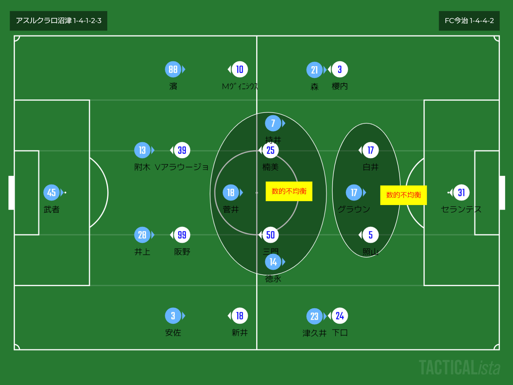 今治が1-4-4-2で、沼津が1-4-1-2-3ということで、中盤と今治最終ラインのところが数的不均衡になりますね。