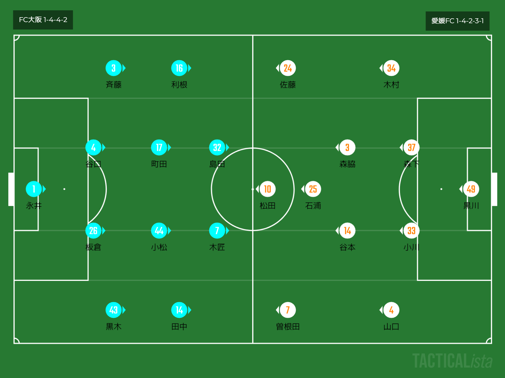 フォーメーション 1-4-4-2(大阪)1-4-2-3-1(愛媛)