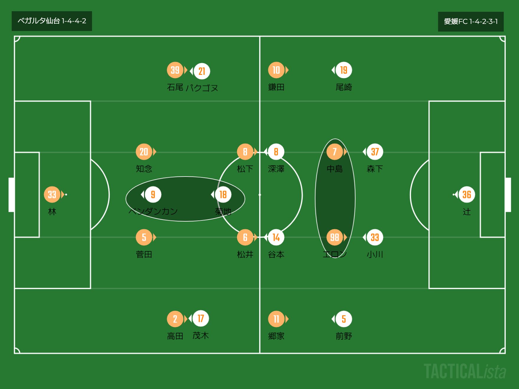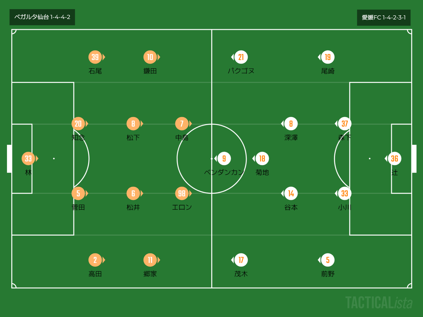 フォーメーション 1-4-4-2(仙台)1-4-2-3-1(愛媛)