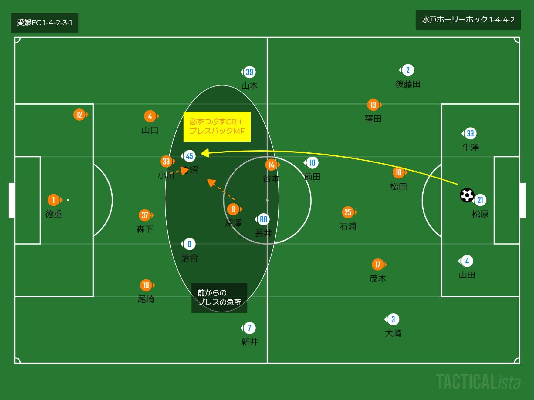 逆にデメリットはCBとMFのライン間のスペースがぽっかり空いてしまうことだろう。しかし、愛媛はここを谷本深澤の運動量で、挟み込み(プレスバック)が肝となる。