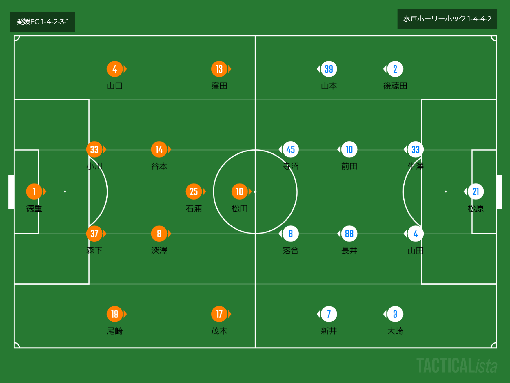 フォーメーション 1-4-2-3-1(愛媛)1-4-4-2(水戸)