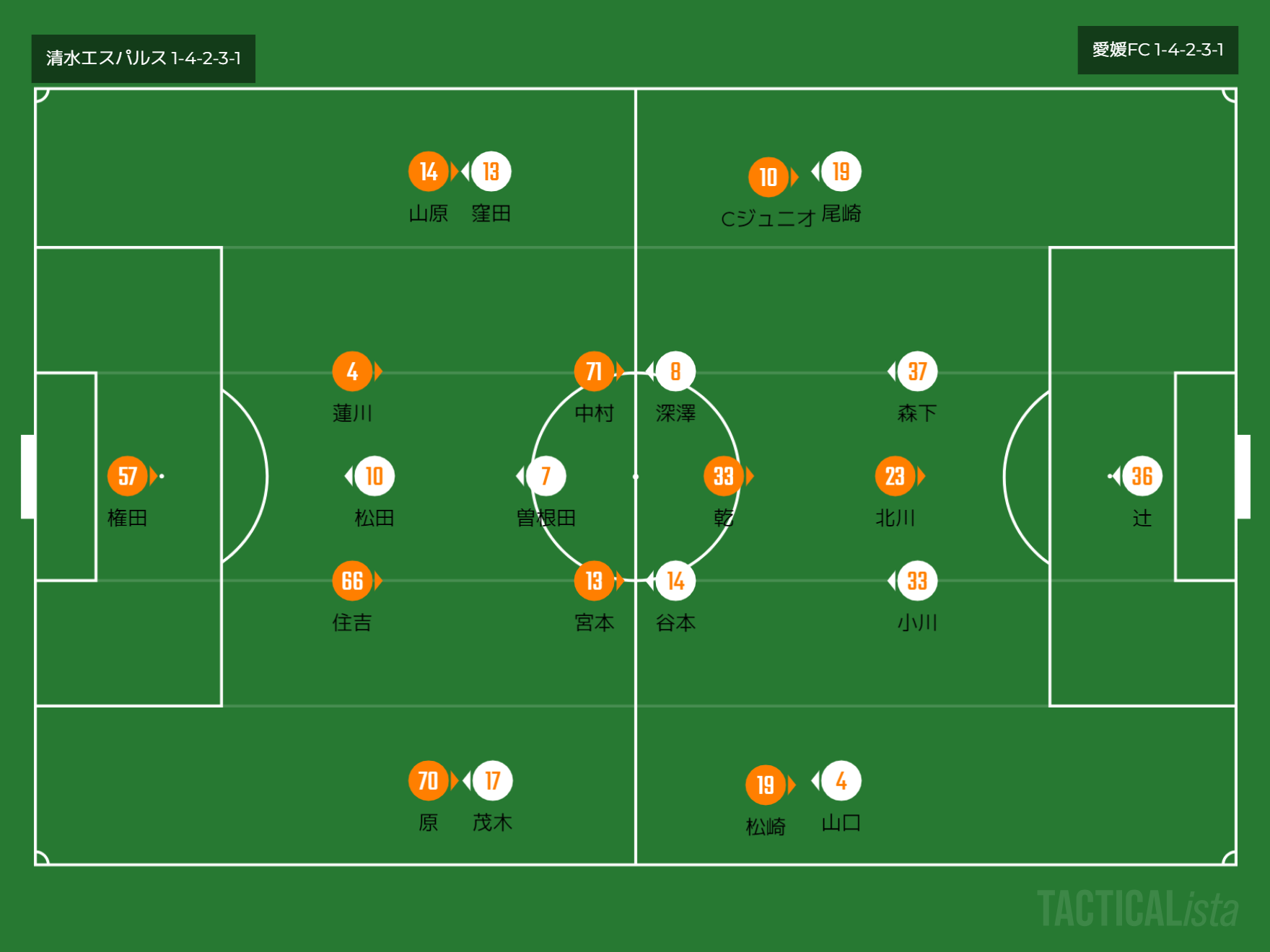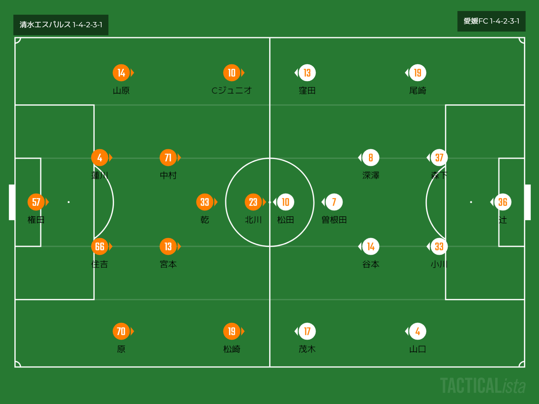 フォーメーション 1-4-2-3-1(清水)1-4-2-3-1(愛媛)