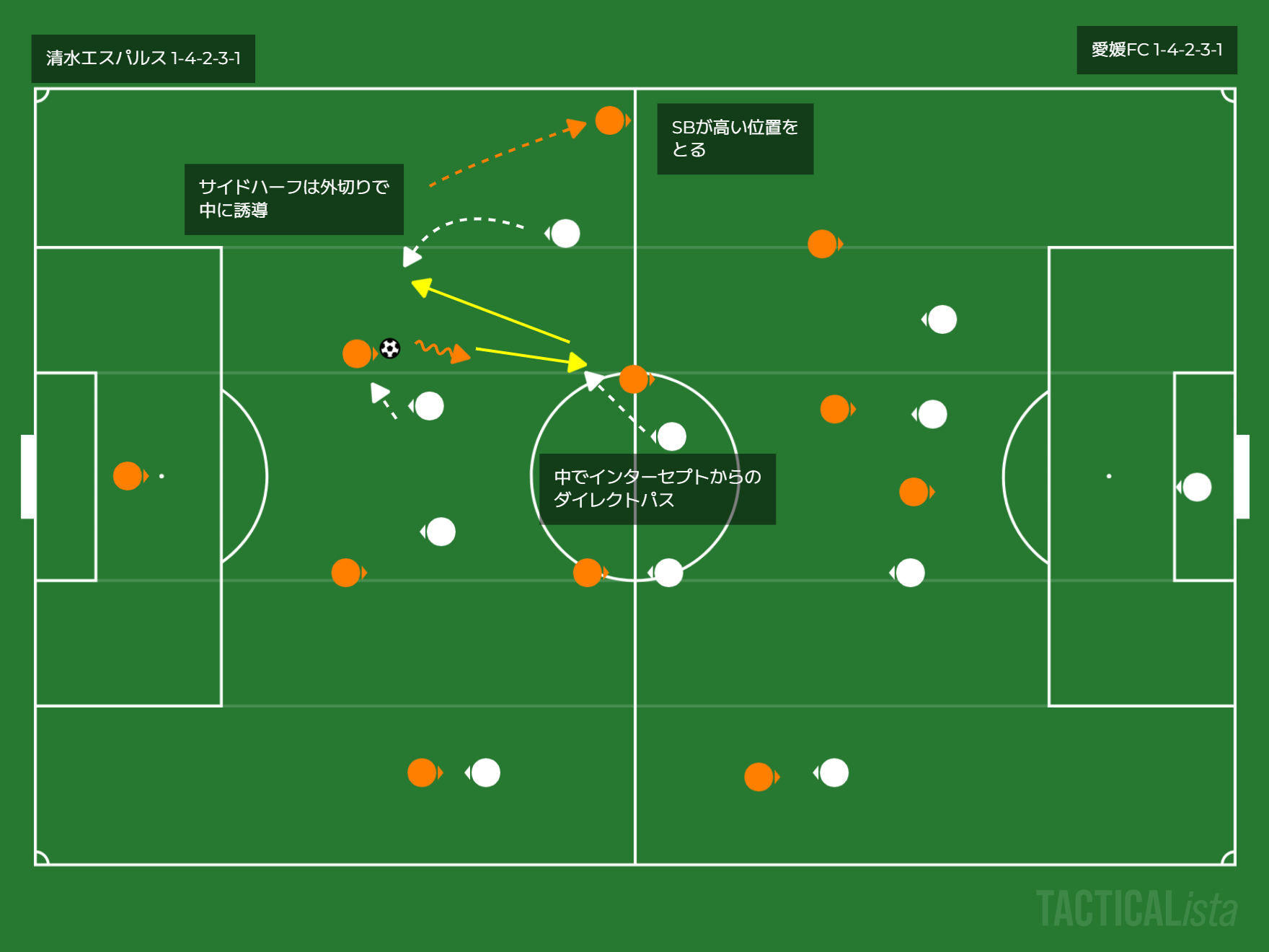 清水はCBが持ち出し、SBと数的優位を作ろうとSBが高い位置をとろうとするが、愛媛SHの外切りプレスによって、中に誘導され、そこでインターセプトからダイレクトパス。