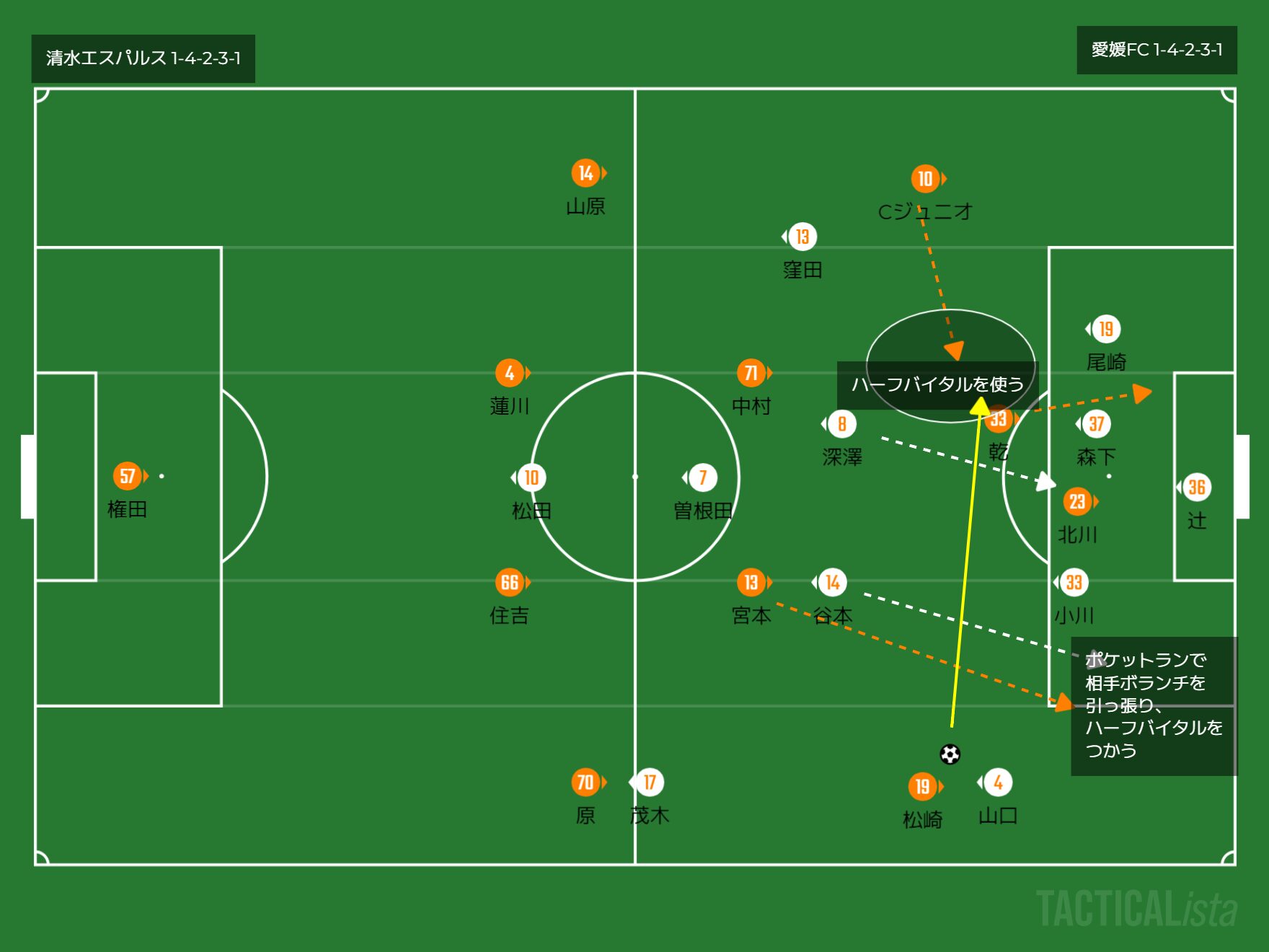 前半早々の清水の攻撃。案の定、サイドチェンジからのポケット狙い。だが、愛媛の方もボランチが対応し、ポケット封鎖。だが、中央のバイタルをケアする愛媛の選手はボランチ1人となる。