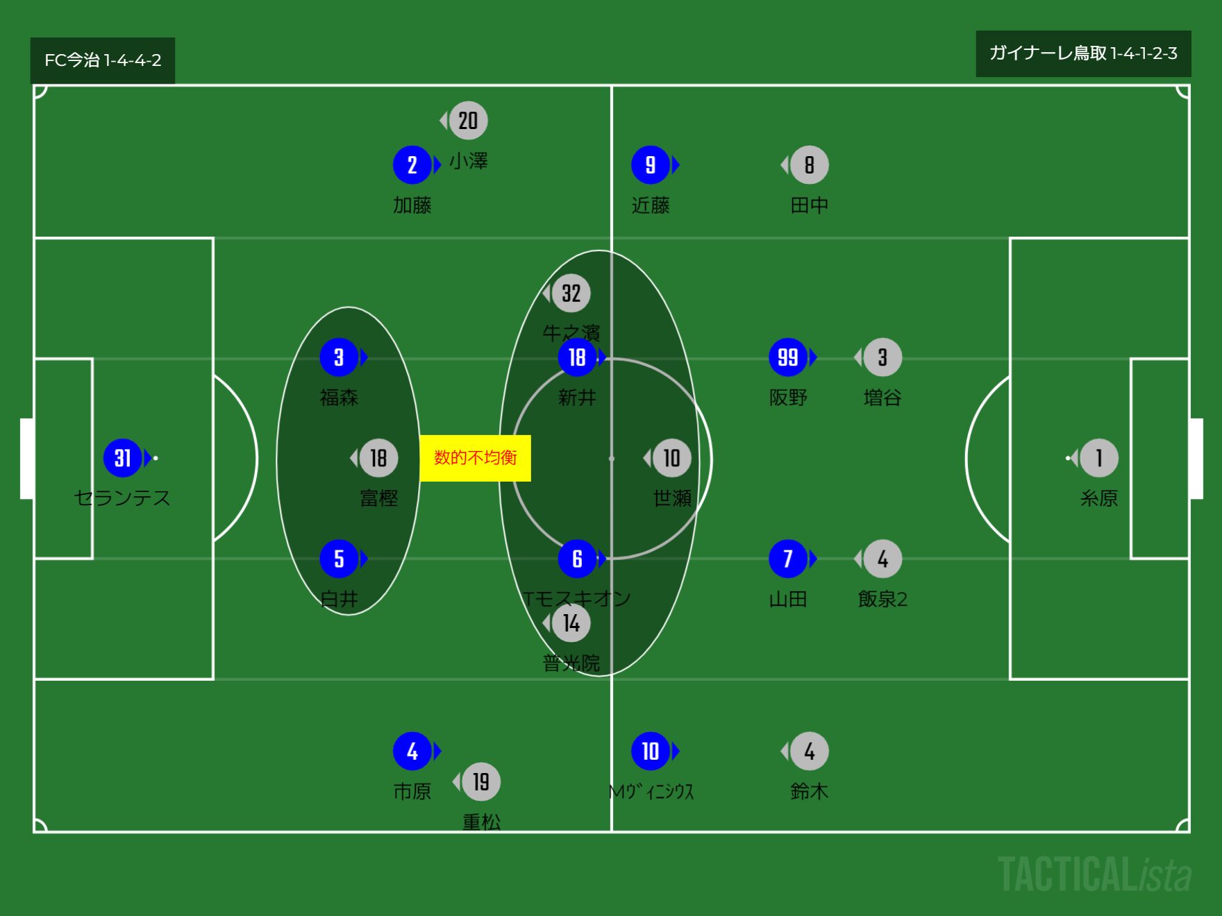 今治CBと鳥取1トップのところと中盤のところで数的不均衡になる。中盤までは鳥取がボールを保持できるようになるが、最終ラインでは今治の人数が多くなる。