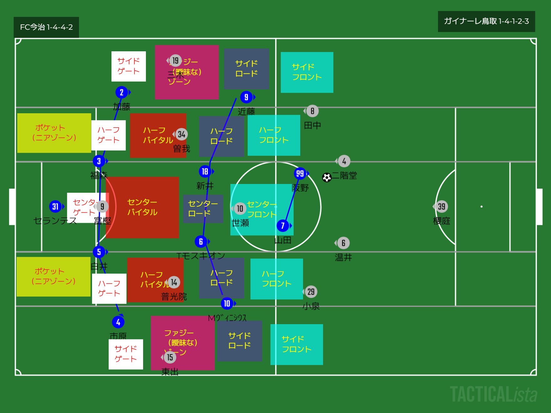1-4-1-2-3の鳥取は今治とのかみ合わせ上、ポケットを狙いやすくなる。ハーフバイタルやファジーゾーンに人を立たせ、ポケットを狙っていく。