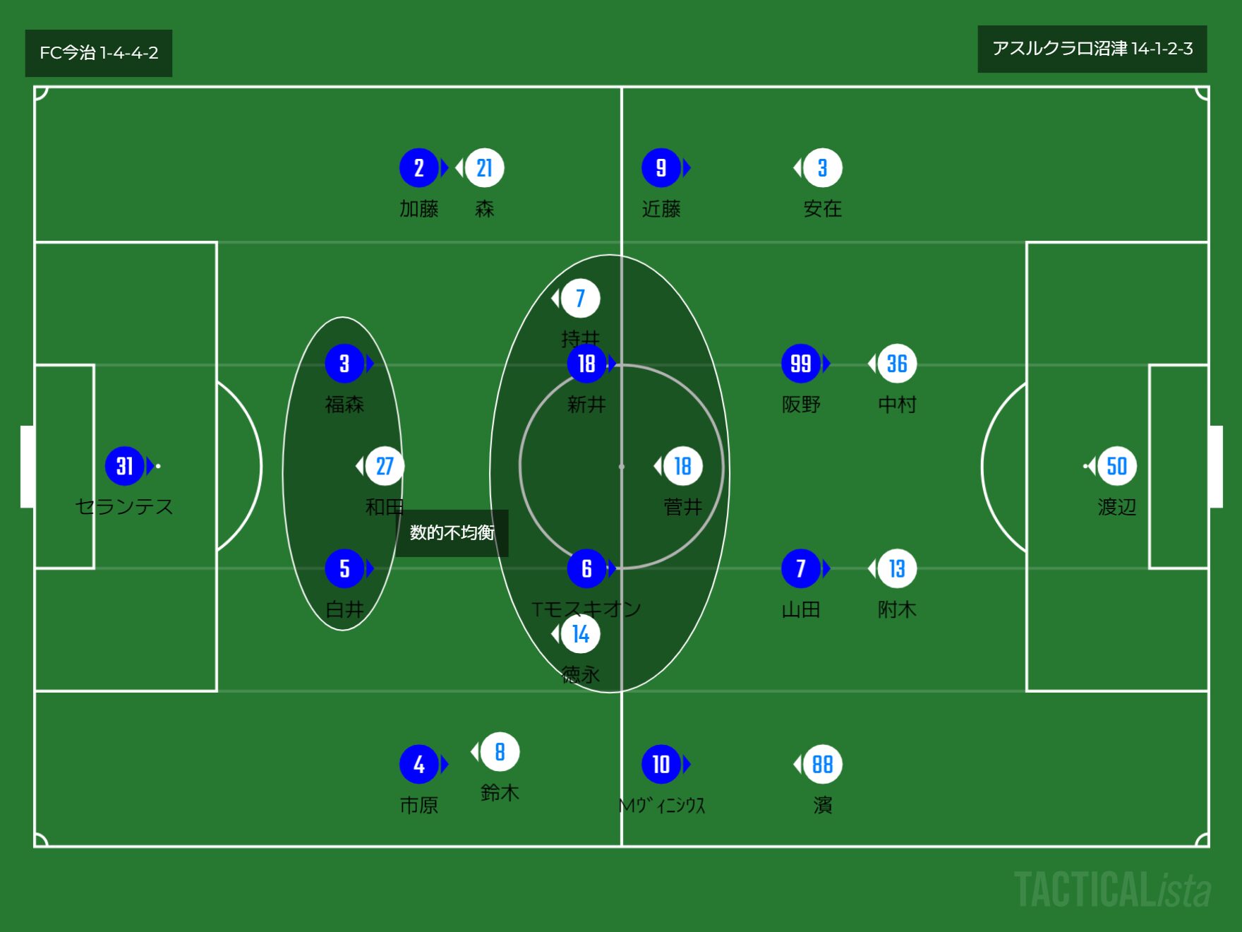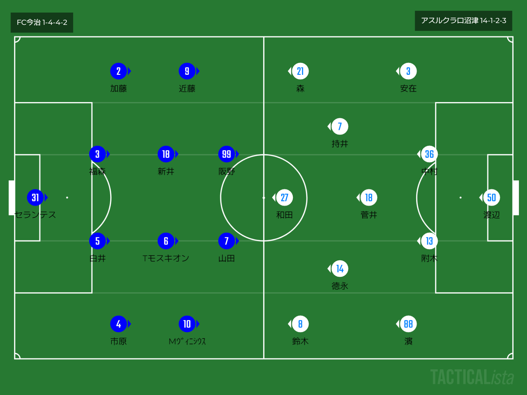 噛み合わせは次の通り、今治が1-4-4-2で沼津が1-4-1-2-3ですね。