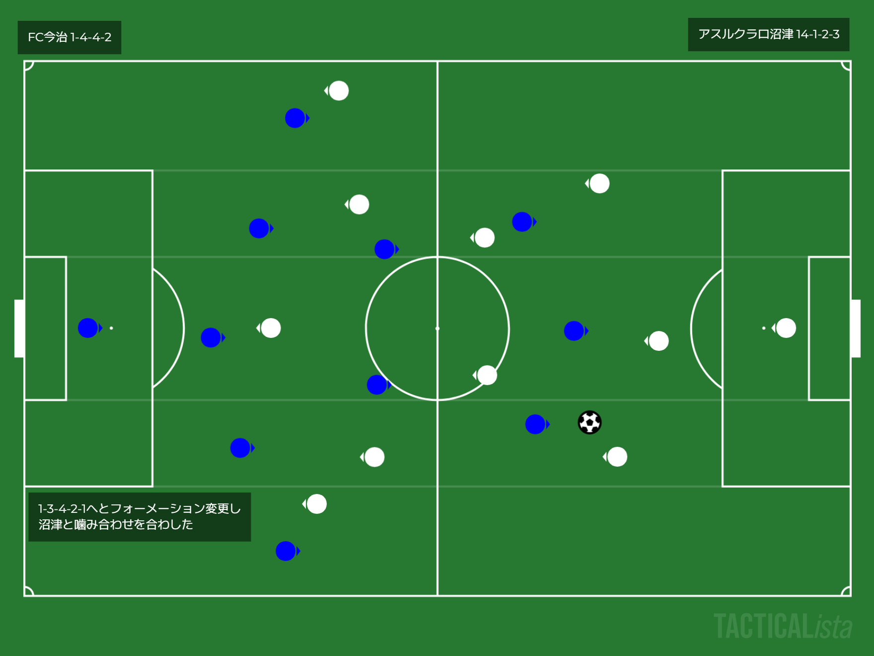 沼津はボールを自分たちが保持するために可変システムを使用。