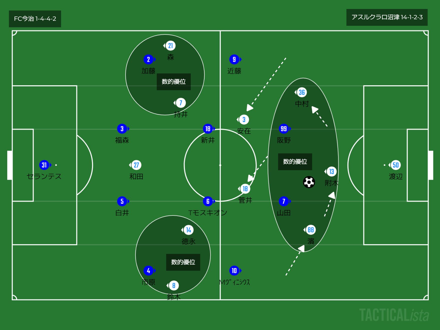 今治のCBのところと中盤のところで数的不均衡となっている。