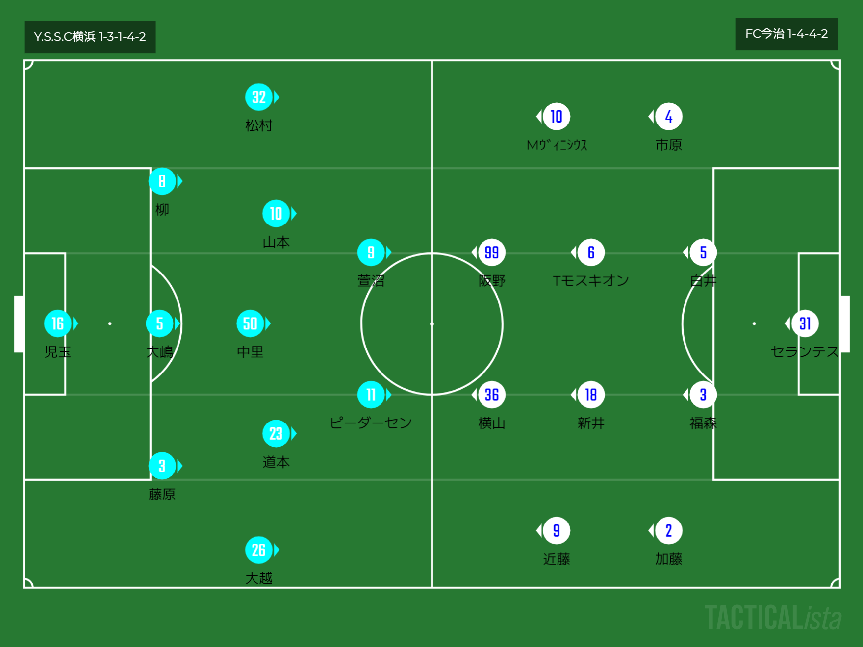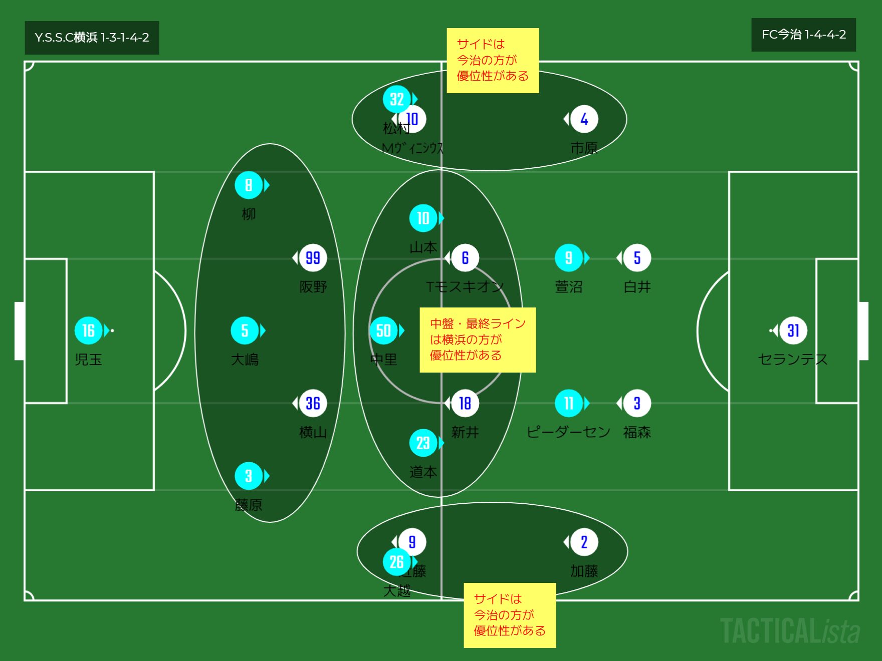 横浜は1-3-1-4-2で今治は1-4-4-2となっており、中央レーンでは横浜が数的優位ですが、サイドレーンでは今治が優位となっていますね。